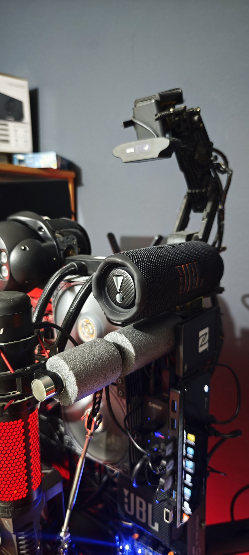 * **Dual-Audio JBL System:** A **JBL Flip 7** for high-output, bass-heavy immersion and a **JBL Go 3** for clear, balanced frequency response during professional tasks.